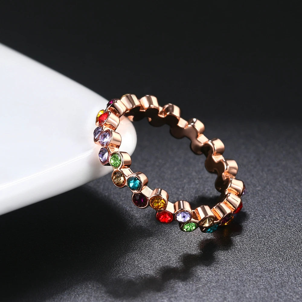 טבעת רוז־גולד אלגנטית ומשובצת אבני זירקון צבעוניות בגימור יוקרתי, המסודרות סביב הטבעת ליצירת מראה חי, ייחודי ומלא סטייל.